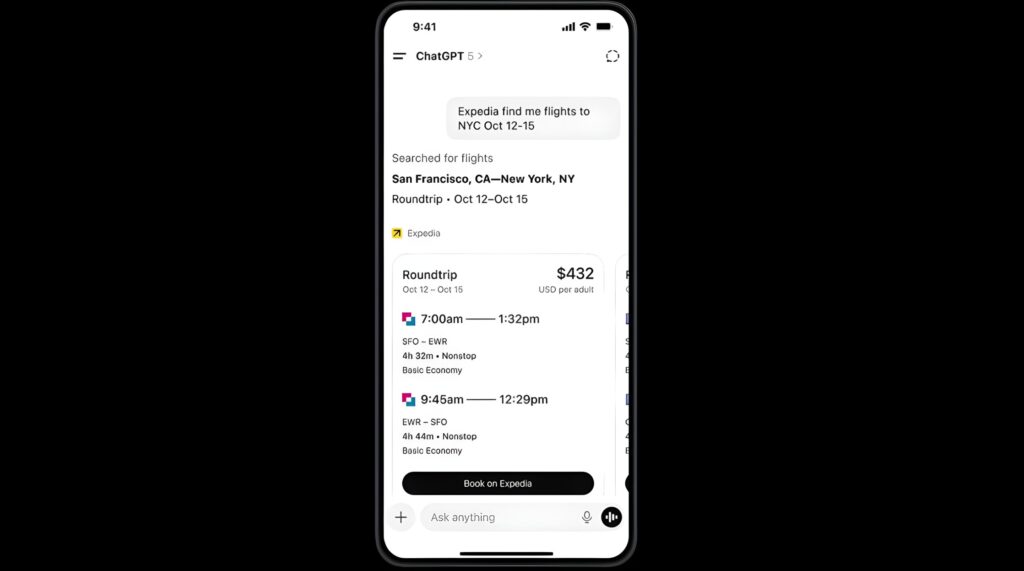 ChatGPT can surface hotel options and flight choices through Expedia directly within the chat, so you don’t need to switch platforms. Whether you’re planning a short getaway or an extended trip, it can identify flights that match your travel dates, budget, and number of travelers. You can refine results with preferences like “Only show 4-star hotels.” When you find an option that works, you can proceed to Expedia to complete your booking.