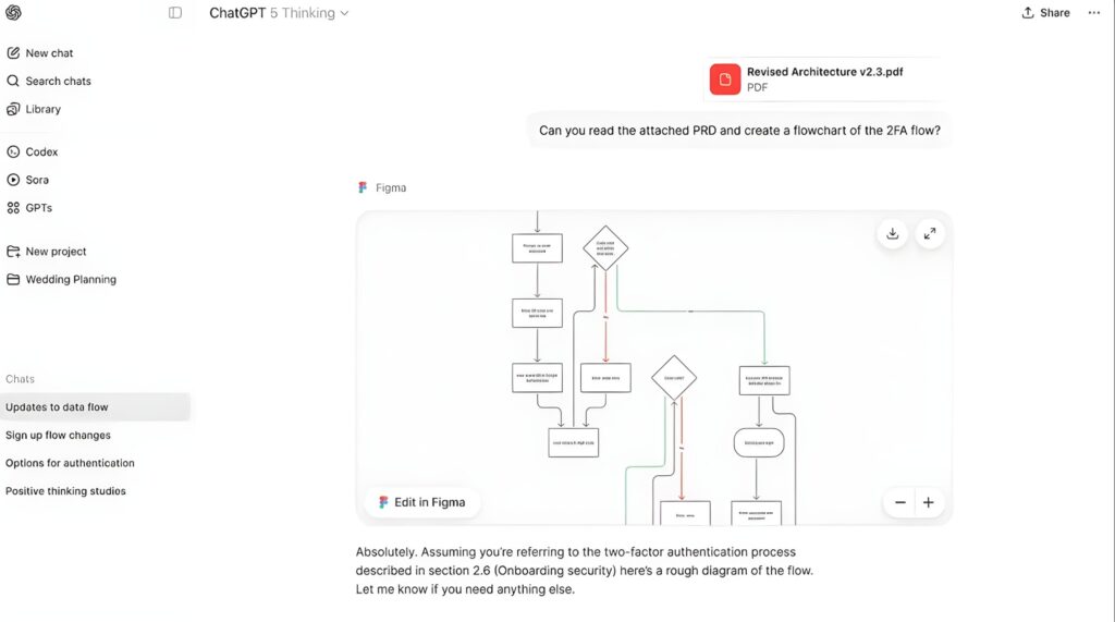You can use Figma within ChatGPT to create diagrams, flowcharts, and other visuals, making it easier to turn ideas and brainstorming sessions into concrete outputs. This is especially useful for illustrating complex concepts or mapping out workflows.