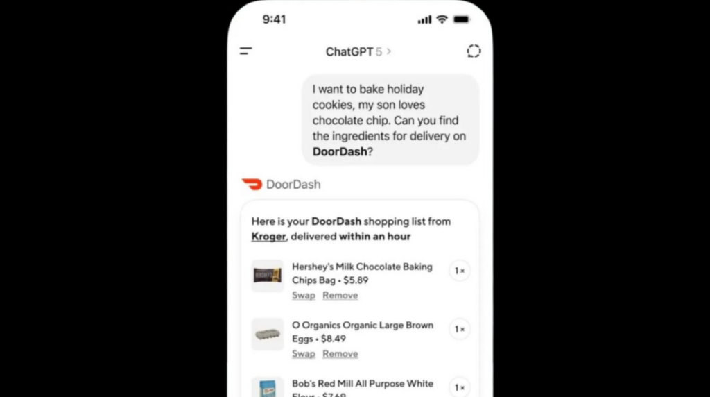 DoorDash rolled out its ChatGPT integration in December 2025 to streamline meal planning and grocery shopping. With this feature, users can request a meal plan through the chatbot and automatically add all required ingredients to their DoorDash cart, ready for review and checkout.